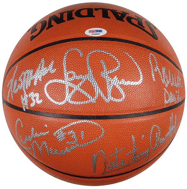 Official Spalding NBA basketball signed in silver ink on the side panels by five members of the 1981 World Champion Celtics: Larry Bird, Kevin McHale, Robert Parrish, Cedric Maxwell, and Nate Archibald. Accompanied by a letter of authenticity from PSA/DNA. In very fine condition, with a PSA/DNA authentication label affixed to ball. Auction LOA Steve Grad/PSA/DNA and R&R COA.