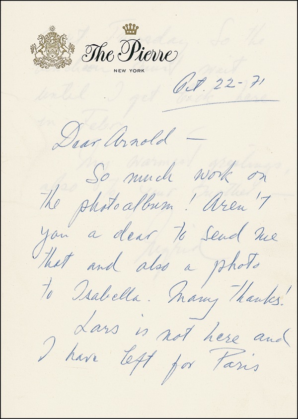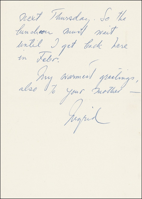 ALS signed “Ingrid,” two pages, 5.5 x 7.5, Pierre Hotel, New York letterhead, October 22, 1971. Bergman writes to Arnold. In part: “So much work on the photo album! Aren’t you a dear to send me that and also a photo to Isabella [Rossellini, her daughter]. Many thanks! Lars is not here and I have left [sic] for Paris next Thursday. So the luncheon must wait until I get back here in Febr….” Accompanied by a copy of a later letter to Bergman. Mailing fold just touching “I” and a few mild wrinkles, otherwise fine condition. R&R COA.