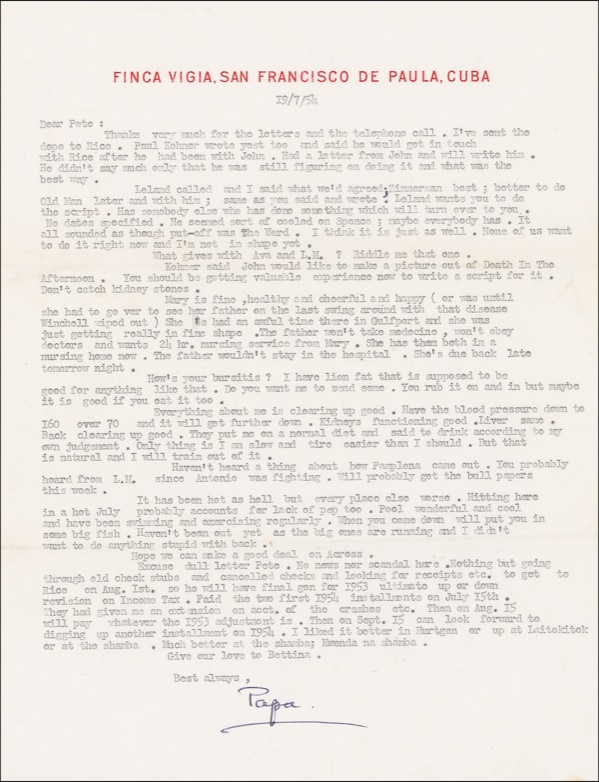 TLS signed “Papa,” one page, 8.25 x 11, personal Finca Vigia, Cuba letterhead, July 19, 1954. Hemingway writes to novelist and screenwriter Peter Viertel (1920–2007), whose works included the Hemingway memoir Dangerous Friends and the screenplays for Hemingway’s own The Sun Also Rises and The Old Man and the Sea. In part: “Thanks for the letters and the telephone call. I’ve sent the dope to Rice. Kohner wrote yest[erday] too and said he would get in touch with Rice after he had been with John [Huston]. Had a letter from John and will write him. He didn’t say much only that he was still figuring on doing it and what was the best way.Leland called and I said what we’d agree; Zinnerman [director Fred Zinneman] best; better to do Old Man [and the Sea] later and with him; same as you said and wrote. Leland wants you to do the script. Has somebody else who has done something which will turn over to you. No dates specified. He seemed sort of cooled on Spence [Spencer Tracy; who ultimately won the role]; maybe everybody has. It all sounded as though put-off was The Word. I think it is just as well. None of us want to do it right now and I’m not in shape yet…. Kohner said John would like to make a picture out of Death in the Afternoon. You should be getting valuable experience now to write a script for it. Don’t catch kidney stones….Mary [Hemingway, his wife] is fine, healthy, cheerful and happy (or was until she had to go see her father on the last swing around with that disease Winchell wiped out)…. How’s your bursitis? I have lion fat that is supposed to be good for anything like that. Do you want me to send some. You rub it on and in but maybe it is good if you eat it too.Everything about me is clearing up good. Have the blood pressure down to 160 over 70 and it will get further down. Kidneys functioning good. Liver same. Back clearing up good. They put me on a normal diet and said to drink according to my own judgement. Only thing is I am slow and tire easier than I should. But that is natural and I will train out of it….It has been hot as hell but every place else worse. Sitting here in a hot July probably accounts for lack of pep, too…. When you come down will put you in some big fish. Haven’t been out yet as the big ones are running and I didn’t want to do anything stupid with back….”A few wrinkles and edge creases, otherwise fine condition. Unusually rich in themes and references closely associated with the great writer’s career! Auction LOA John Reznikoff/PSA/DNA and R&R COA.