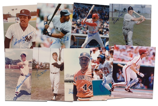 Nine 8 x 10 color photos, one each signed in felt tip by Dave Winfield, Reggie Jackson, Johnny Bench, George Kell, Eddie Mathews, Willie Mays, Willie McCovey, Kirby Puckett, and Mike Schmidt. In fine condition. R&R COA.