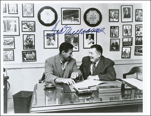 Glossy 10 x 8 photo of Williams and Tom Yawkey sharing a laugh at the Red Sox office, signed in blue felt tip by Williams. In very fine condition. Auction LOA Steve Grad/PSA/DNA and R&R COA.