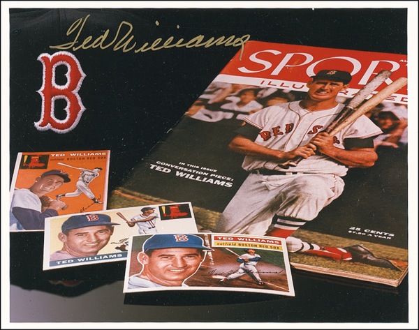 Color glossy 10 x 8 composite photo of Ted Williams baseball cards and a magazine, signed in gold ink. In very fine condition. Auction LOA Steve Grad/PSA/DNA and R&R COA.