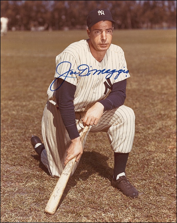 Color satin-finish 8 x 10 photo of DiMaggio taking a knee in his Yankee pinstripes, signed in blue felt tip. In very fine condition. Auction LOA Steve Grad/PSA/DNA and R&R COA.