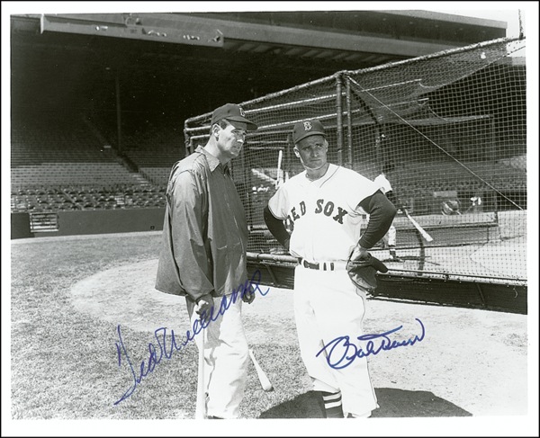 Glossy 10 x 8 photo of Williams and Doerr talking by the batting cage at Fenway Park, signed in blue felt tip by both Williams and Doerr. In very fine condition. Auction LOA Steve Grad/PSA/DNA and R&R COA.