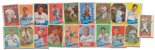 Sixteen Fleer baseball trading cards, each signed on the front in felt tip by the respective player pictured. Signers are: Lloyd Waner, Ted Williams, Lou Boudreau (2), Bob Feller (2), Rick Ferrell, Chas. Gehringer (2), Lefty Gomez (2), Johnny Mize (2), Ralph Kiner (2), Luke Appling, Carl Hubbell, and Bill Terry. In fine condition. R&R COA.