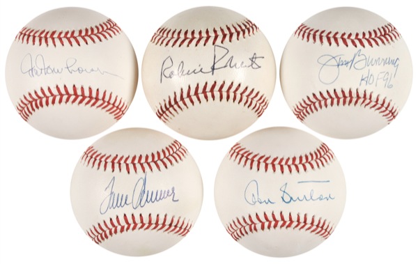 Five official Rawlings and Spalding baseballs, each signed on the sweet spot in ballpoint by a different pitcher. Signers are: Tom Seaver, Jim Bunning, Hal Newhouser, Don Sutton, and Robin Roberts. In fine condition, with some scattered light toning. R&R COA.