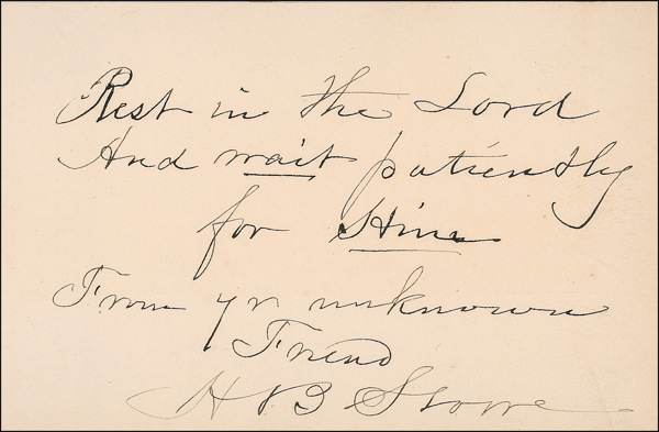 Distinguished author (1811–1896) whose epochal 1852 novel Uncle Tom’s Cabin brought the issue of slavery to the fore of American consciousness and became one of the classics of 19th-century literature. AQS, an extract from Psalm 37, “Rest in the Lord and wait patiently for Him, From yr. unknown friend, H. B. Stowe,” on a cream 3.75 x 2.5 card. Mounting remnants to reverse, otherwise very fine, clean, bright condition. R&R COA.