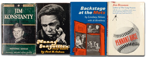 Four hardcover books: Backstage at the Mets, signed and inscribed by Lindsey Nelson; Manny Sanguillen, signed by Sanguillen; Jim Konstanty, signed and inscribed by Jim Konstanty; and Pennant Race, signed and inscribed by Jim Brosnan. In very good condition, with scattered wear and tear to dustjackets, and some mild toning to a couple of signed pages. R&R COA.