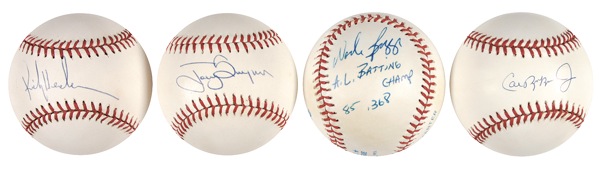 Four official Rawlings American and National League baseballs, each signed in ballpoint on the sweet spot or side panel by a different player. Signers are: Cal Ripken, Jr., Tony Gwynn, Ricky Henderson, and Wade Boggs. In fine condition, with a bit of scattered light toning. R&R COA.