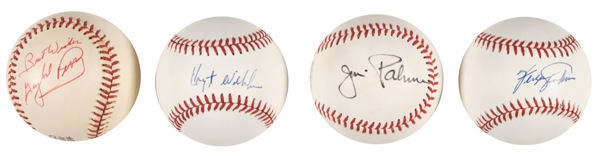 Four official Rawlings and Spalding American and National League baseballs, each signed in ballpoint or felt tip on the sweet spot or side panel by a different Hall of Fame pitcher. Signers are: Jim palmer, Hoyt Wilhelm, Fergie Jenkins, and Gaylord Perry. In fine condition, with light overall toning to Perry’s ball. R&R COA.