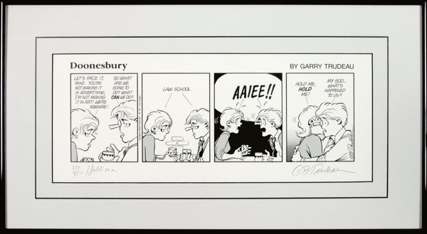 Limited edition print of a law school–themed Doonesbury strip titled “Hold Me,” numbered 828/850, signed in pencil “Garry Trudeau.” Matted and framed to an overall size of 22.25 x 12.25. In very fine condition. R&R COA.