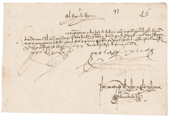 Spanish monarchs best known as the sponsors and patrons of Christopher Columbus. Manuscript DS, in Spanish, signed “Yo el Rey (I the King) and Yo el Reyna (I the Queen),” one page, 8.5 x 5.75, July 22, 1493. The King and Queen authorize Juan de Ribera to act as their agent. In full, “We beseech Dan Juan de Ribera our Captain General in the frontier of Navarra and of our Council that he may speak to you of our transaction which we place at your disposal and we request that you fully vouch for and guarantee to the effect that such deed be executed.” In fine condition, with previous storage folds touching a couple letters of signature, some light ink offsetting, and some scattered faint foxing. Auction LOA John Reznikoff/PSA/DNA and R&R COA.