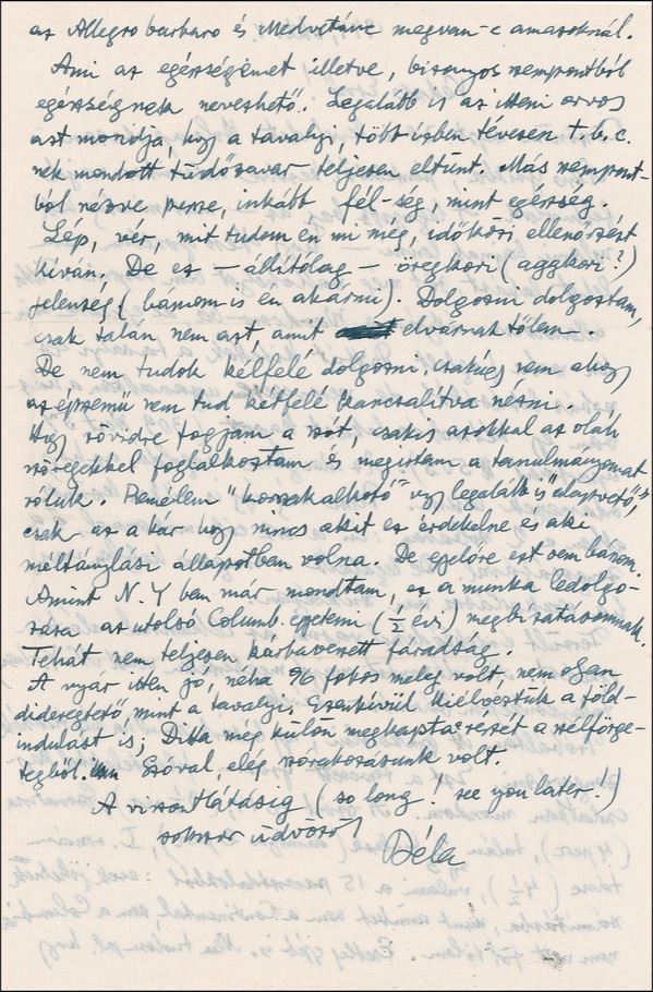Hungarian-born musician (1881–1945) who, through his far-reaching endeavors as composer, performer, educator, and ethnomusicolgist, emerged as one of the most forceful and influential creative personalities of the twentieth century. ALS in Hungarian, signed “Béla,” one page both sides, 6.25 x 9.25, October 4, 1944. Bartók writes to his friend and fellow composer/pianist Erno Balogh (1897–1989). Bartók sends greetings and personal news and reports on his recent activities, mentioning that he is looking forward to negotiations with [music publisher] Elkan, and that he is hoping to record a number of his own piano works (including the Suite Op. 14, Sonatina, Burlesques, and Romanian Dance No. 1). He goes on to complain about his poor health and has been busy exclusively with “certain Romanian lyrics” and has written a study on them, even though no one seems to be interested. Accompanied by the original mailing envelope addressed in Bartók’s hand, including the return address with his block printed signature “B. BARTÓK.” Bartók had fled Europe at the outbreak of World War II and settled in America. Though he was diagnosed with leukemia shortly thereafter and was plagued by illness in his final years, he managed to produce some of his greatest works, including the Concerto for Orchestra and his unfinished Viola Concerto (completed by his pupil, Tibor Serly). Faint show-through of ink, otherwise very fine, clean condition. R&R COA.