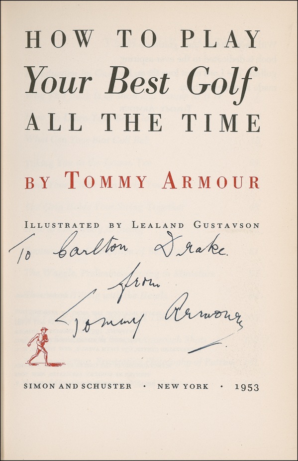 American golfer (1894–1968) who, despite suffering a severe eye injury during World War I, went on to win three major titles. Signed book: How to Play Your Best Golf All the Time. First edition, later printing. NY: Simon and Schuster, 1953. Hardcover, 6 x 9.25, 151 pages. Signed and inscribed in ink on the title page, “To Carlton Drake from Tommy Armour.” Light wear to extremities (small tears and chips to spine ends), otherwise fine, tight condition. Auction LOA Steve Grad/PSA/DNA and R&R COA.
