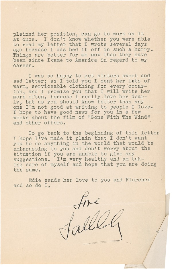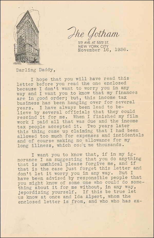 TLS signed “Love, Tallulah,” two pages, 5.5 x 8.5, Gotham Hotel, New York letterhead, November 16, 1936. Bankhead writes to her father, House Majority Leader (and future House Speaker) W. B. Bankhead. In part: “I don’t want to worry you in any way and I want you to know that my finances are in good order; but this income tax business has been hanging over for several years. I have always been led to believe by several officials that they could rescind it for me. When I finished my film work I paid all that was due and the income tax people accepted it. Two years later this thing came up claiming that I had been allowed too much for expenses and incidentals and of course making no allowance for my long illness, which cost me thousands. I want you to know that, if in my ignorance I am suggesting that you do anything that is unethical please forgive me, and if that is the case just forget this letter and don’t let it worry you in any way. But I have been advised by responsible people that you might know of some one who could do something about it for me without, in any way, jeopardizing yourself. If this be true let us know at once and Ida Alpert, whom the enclosed letter is from … can go to work on it at once…. Things are better for me now that they have been since I came to America in regard to my career…. I’m not good at writing to people I love. I hope to have good news for you in a few weeks about the film of ‘Gone with the Wind’ and other offers….” Stapled to Bankhead’s letter is the TLS from Alpert to Congressman Bankhead, dated November 16, as well as an unsigned carbon of the letter Tallulah received from her father in response, dated November 19. Alpert’s letter reads, in part: “I am impelled to write you, because of a very serious matter ... Miss Bankhead’s Income Federal Tax Return for the year 1932 where there is now a deficiency of $12,000. You realize, of course, that this is a large sum of money and Miss Bankhead would be very much embarrassed to meet so big an amount…. After thinking the matter over very carefully, I feel the only one who could suggest a means of settling this amount or materially reducing it through a compromise would be yourself….” Congressman Bankhead responds to Tallulah: “I am, of course, glad that you wrote to me about this matter and it will be no embarrassment whatever to me to undertake to be of every possible assistance…. It does seem to me that it is a very large claim for excess taxes for one year…. We have been most anxious to hear something definite about whether you would be engaged to play the part of Scarlett O’Hara in ‘Gone with the Wind.’ We have daily inquiries from everywhere from your friends, many of whom seem to think that the matter has already been settled, but I have told them that it had not….” Light handling wear, otherwise fine condition. R&R COA.