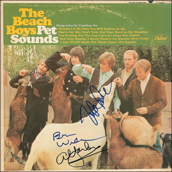 Pet Sounds album signed on the front cover in blue and black felt tip by Brian Wilson, Al Jardine, and Mike Love. In fine condition, with some scattered light edge dings, and light ‘ring of wear’ to cover. The record is included. COA Roger Epperson/REAL and R&R COA.