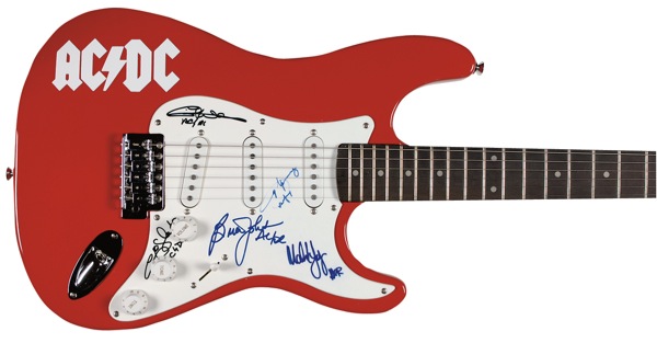 Bright red-bodied S101 ‘stratocaster-style’ electric guitar, with the band’s name on the body, signed on the white pickguard in felt tip by Angus Young, Brian Johnson, Malcolm Young, Cliff Williams, and Chris Slade. In fine condition, with a couple slight brushes to a couple of signatures. COA Roger Epperson/REAL and R&R COA. Oversized.