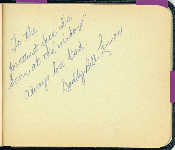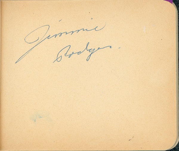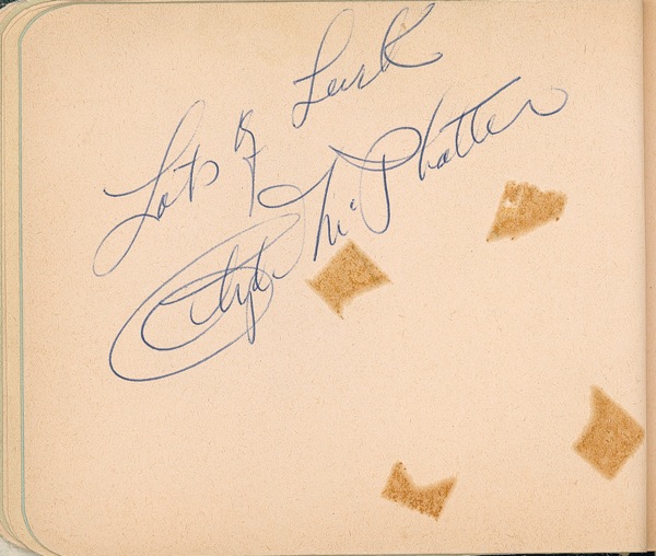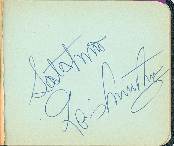 Vintage leatherette-bound autograph album, 6 x 4.75, containing more than 20 mostly double-sided ballpoint signatures, several with personalized inscriptions. Represented: Daddy Bill Lennon (father of the Lennon Sisters; shot and killed by a deranged fan in 1969), the Lennon Sisters (all in a single hand), Brenda Lee, Jimmie Rodgers, the Storey Sisters, Louis Armstrong (adding “Satchmo”), Clyde McPhatter, Gary Williams, Buddy Knox, Paul Anka, Cliff Holland, Larry Collins, Lorrie Collins, Johnny Drake, Don Stevenson, Johnny Horton, and Bobby Burgess. In fine condition overall, with mild scattered toning (tape stains to McPhatter page near but not touching signature). R&R COA.