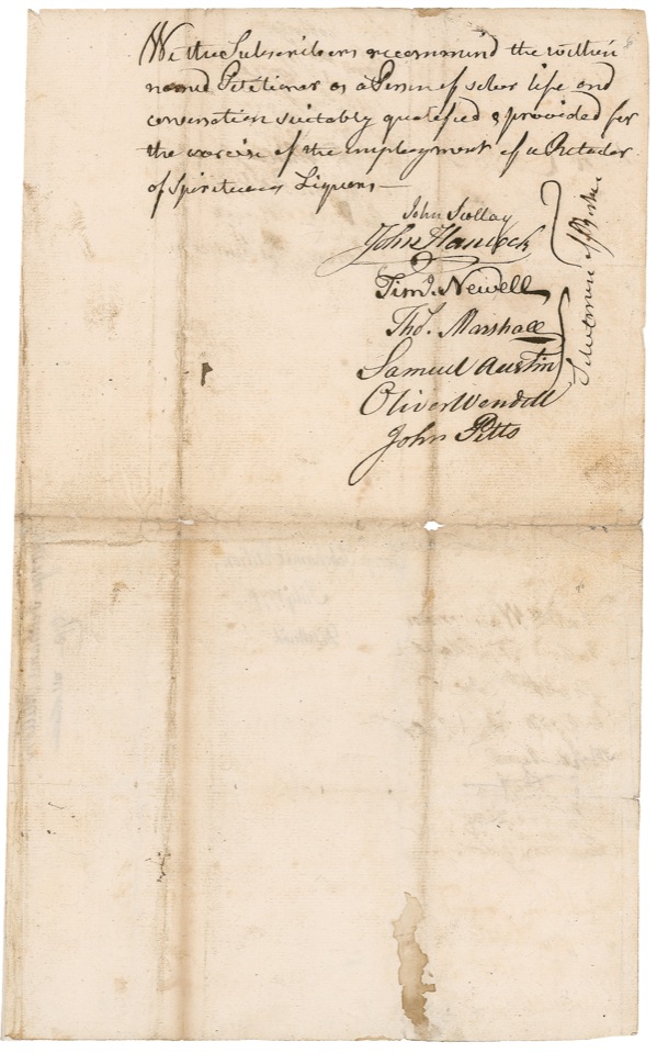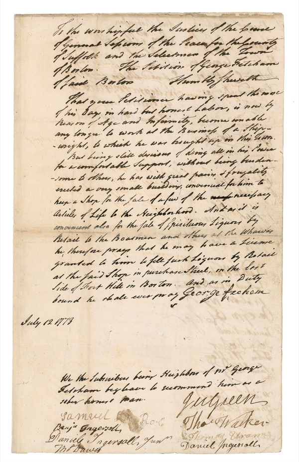 “THE SALE OF SPIRITOUS LIQUORS BY RETAIL TO THE BOATMEN”: Months before the Boston Tea Party, patriot/brewer SAMUEL ADAMS and Declaration Signer JOHN HANCOCK sign a petition for a Boston liquor license