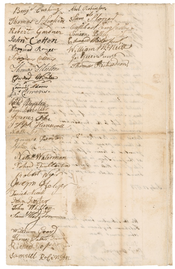 Manuscript DS in the hand of Samuel Adams, signed “John Hancock” and “Samuel Adams” and also signed by more than 50 others, three pages on two sheets slightly trimmed in size to 7.25 x 12, July 12, 1773. A petition for the granting of a liquor license. In part: “To the worshipful the Justices of the Court of General Sessions of the Peace for the County of Suffolk and the Selectmen of the Town of Boston: The Petition of George Fetcham of said Boston honorably sheweth that your Petitioner having spent the most of this Days in hard but honest Labor, is now by Reason of Age and Infirmity, become unable any longer to work at the Business of a Shipwright, to which he was brought up in this Town. But being still desirous of doing all in his Power for a comfortable Support, without being burdensome to others, he has with great pains & frugality erected a very small building, convenient for him to keep a Ship for the Sale of a few of the necessary Articles of Life to the Neighborhood. And as it is convenient also for the sale of Spiritous Liquors by Retail to the Boatmen and others at the Wharves he therefore prays that he may have a License granted to him to sell such Liquors by Retail at the said Shop in Purchase Street....” In addition to Hancock and Adams, other prominent signers include Thomas Urann, Daniel Ingersoll, and Samuel Sloper (all participants in the Boston Tea Party in the following December), Oliver Wendell (judge and grandfather of poet Oliver Wendell Holmes), and Sam Hodgdon (later appointed by Washington as the first U.S. Quartermaster General). In very good condition overall, with intersecting folds (a few pinholes and edge separations; vertical fold through Hancock’s “H”; a few archival tape and silking reinforcements to folds), marginal archival tape along edges where sheets were formerly joined, light show-through of ink, and scattered soiling, toning, and light staining. The signatures are dark and clear. A scarce and historic combination of two fabled American statesmen! R&R COA.