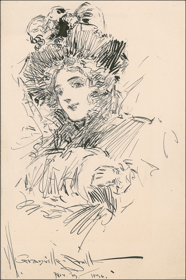 Painter and illustrator who studied with W. Satterlee, C. Beckwith and Willard Metcalf at the Arts Student League in New York City and in Paris at the Academie Julian. He is renown for his charming genre scenes of young children and women involved in pleasurable activities along the shore, in parks and along city streets. Original vintage signed ink sketch of a luxuriously dressed woman in a decorative hat and muff on an off-white 3.25 x 5 card, signed at the bottom, “W. Granville-Smith, November 19, 1896. In fine condition. R&R COA.