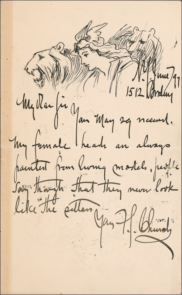 Illustrator best known for his work in Uncle Remus. ALS signed “F. E. Church,” one page, 5 x 8, June 1897. Letter to an unidentified gentleman. In full, “Yours May 29 received. My female heads are always painted from living models, people say though that they never look like the sitters.” Church has added a beautiful sketch of two tigers and a woman at the top of the page In fine condition, with light strip of toning to left edge, and some scattered light ink marks. R&R COA.