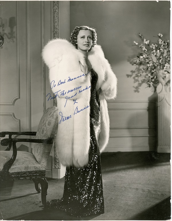 Vintage glossy 10.5 x 13.5 cardstock full-length photo of Dunne in the white fur coat and sapphire blue sequin gown she wore in the film The Awful Truth, signed and inscribed in blue ink “To Bob Morris, with the sincere good wishes of Irene Dunne.” In fine condition, with scattered surface creasing and light edge wear. R&R COA.