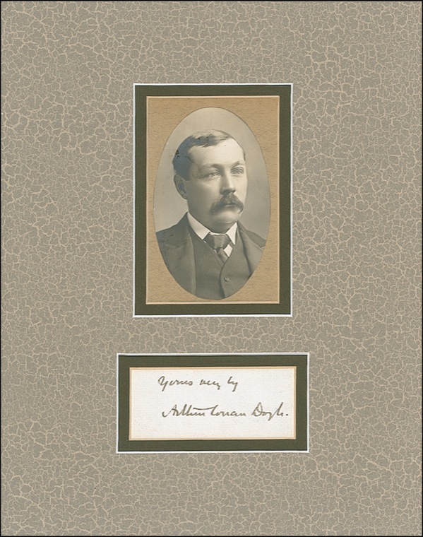 Crisp ink signature, “Yours very truly, Arthur Conan Doyle,” on a light blue slip. Double matted with a small portrait of Doyle, to an overall size of 8 x 10. In very fine condition. R&R COA.