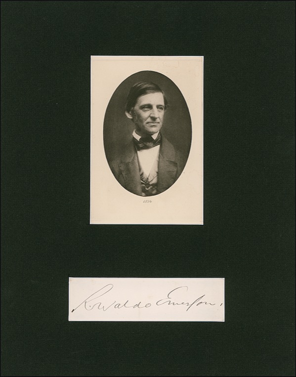 Ink signature, “R. Waldo Emerson,” on an off-white slip. Matted with a nice portrait of Emerson, to an overall size of 11 x 14. In fine condition, with a few light vertical bends and ripples. R&R COA.