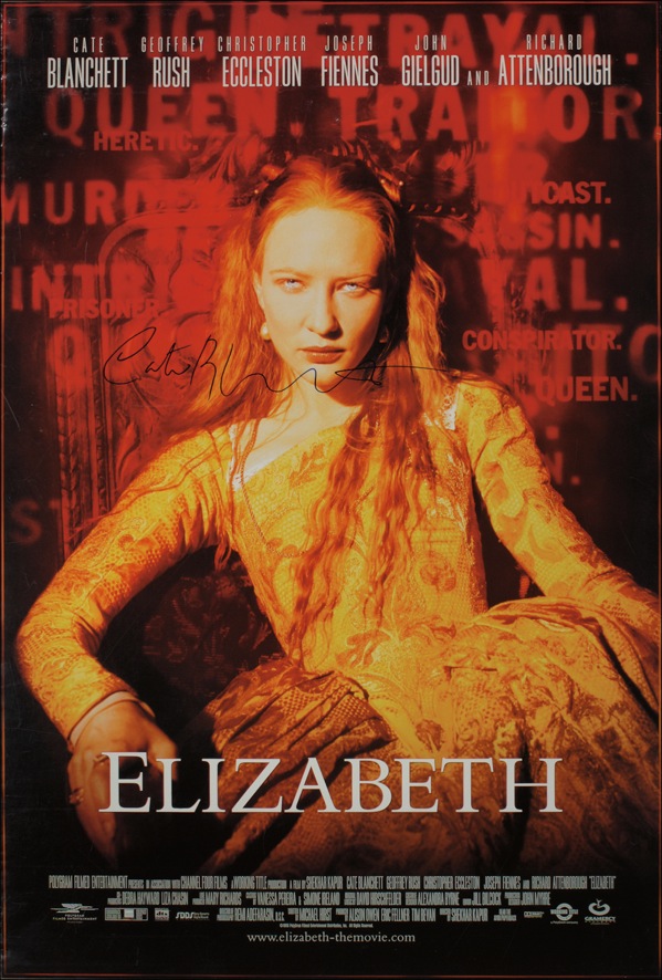 Color 27 x 40 one sheet movie poster for Elizabeth, signed in blue felt tip by Blanchett. Rolled and in fine condition, with some light surface and edge creases. R&R COA.