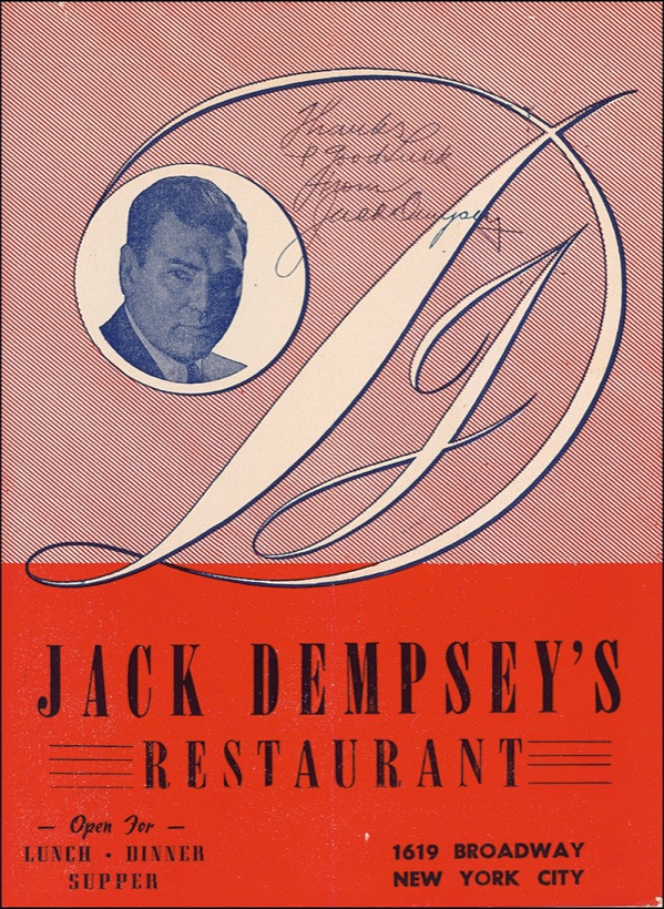 Menu from Dempsey’s New York restaurant, 8 x 11, two pages, signed on the front cover in black ink, “Thanks & good luck from Jack Dempsey.” In fine condition, with mild handling wear and a bisecting vertical fold affecting a single letter of signature. Auction LOA Steve Grad/PSA/DNA and R&R COA.