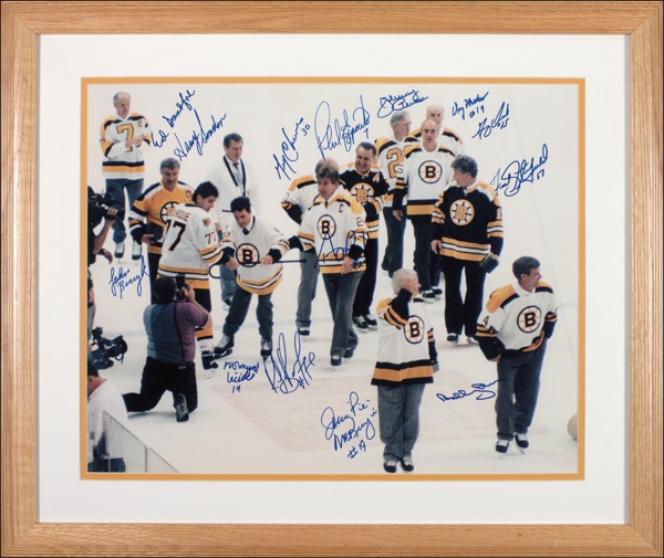 Color glossy 20 x 16 photo of some of Boston’s greatest at the final skate at the old Boston Garden, signed in blue felt tip by thirteen players, including: Bobby Orr, Ray Bourque, Phil Esposito, Gerry Cheevers, ‘Pie’ McKenzie, Johnny Bucyk, Harry Sinden, Johnny Pierson, Gary Doak, Fred Stanfield, and Normand Leveille. Double matted and framed to an overall size of 26.5 x 22.5. When the Boston Garden was closed down in 1995, the Bruins held “A Last Hurrah” to honor the old building. NHL greats like Jean Beliveau, Rocket Richard, Stan Mikita, Bobby Orr, Cam Neely, Phil Esposito, Ray Bourque, and Johnny Bucyk were all there, but it was Leveille who stole the show. He warmed the hearts of all Bruins fans when he joined the Bruins greats for one last skate around the Boston Garden. An ecstatic Leveille donned Bruins jersey #19 and, with the help of Ray Bourque, took one last lap around the Garden. In very fine condition. Auction LOA Steve Grad/PSA/DNA and R&R COA. Oversized.