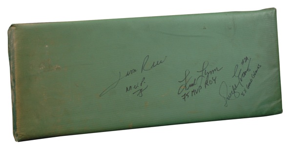 Padded section of a Fenway park outfield door, 27.5 x 11.5, signed in black felt tip by former outfielders Jim Rice, Fred Lynn, and Dwight Evans, each adding their career achievements underneath. Expected wear and soiling, otherwise fine condition. Auction LOA Steve Grad/PSA/DNA and R&R COA.