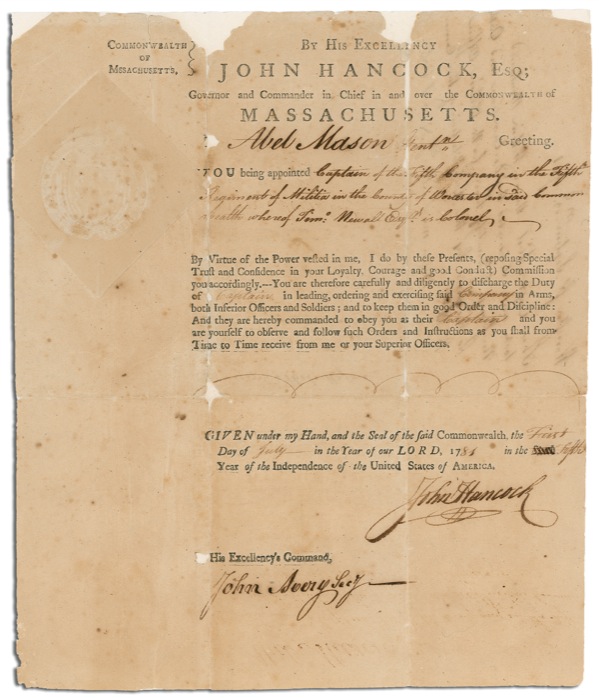 Partly printed DS as governor, one page trimmed in size to 11 x 13, July 1, 1781. A commission for Abel Mason as “Captain of the Fifth Company in the fifth Regiment of Militia in the County of Worcester in said Commonwealth whereof Tim: Newall Estr. is Colonel….” Countersigned by John Avery. In good condition, with intersecting folds (separations, chips, and holes stabilized by expert allover reinforcement to reverse; vertical separation through first letter of signature) and scattered toning with a few small spots. The signature is otherwise extraordinarily bold and clear. Auction LOA John Reznikoff/PSA/DNA and R&R COA.