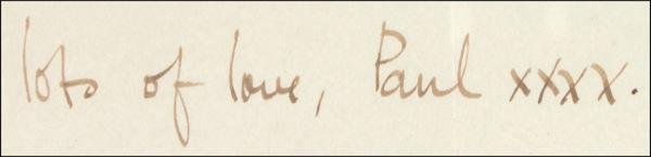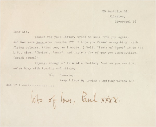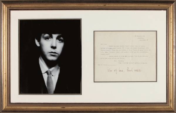 TLS signed “Lots of love, Paul, XXXX,” one page, 7.75 x 6.75, no date [circa early 1963]. Paul writes to Liz. In full: “Thanks for your letter. Great to hear from you again. And how were your exam results??? I hope you passed everything with flying colours. (Fran too, as I wrote.) Well, ‘Taste of Honey’ is on the L.P., also ‘Chains,’ ‘Anna,’ and quite a few of our own compositions. (cough cough). Anyway, enough of this idle chatter, ’cos as you mention, we’re busy with touring and things, so Cheerio. Yes, I know my typing’s getting worse, but see if I care….” All of the songs McCartney mentioned were included on the Beatles’ debut album, Please Please Me, released on March 22, 1963. The album, which included such iconic originals as the title track, “Love Me Do,” and “I Saw Her Standing There,” was later singled out by Rolling Stone magazine as Number 39 on their list of the 500 Greatest Albums of All Time. The address that Paul includes in the header, 20 Forthlin Road in Allerton, Liverpool, was that of his childhood home. The home, one of the group’s rehearsal sites in their earliest days, is now a museum. Matted and framed with a photo to an overall size of 22.25 x 14.25. Intersecting folds (light vertical fold to “Paul”) and light scattered wrinkling, otherwise fine condition. An historic document of the most celebrated group in the history of rock and roll! COA Roger Epperson/REAL and R&R COA.