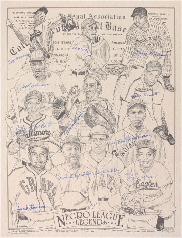 Limited edition print titled “Negro League Legends,” numbered AP 285/300, 22 x 14, signed in blue felt tip by Lester Lockett, “Double Duty” Radcliffe, Josh Johnson, Max Manning, Leon Day, Gene Benson, Bill Cash, Mahlon Duckett, Buck Leonard, Edsall Walker, Monte Irvin, and Bobby Robinson, and also signed in pencil by artist R. Michael Armstrong. In very fine condition. Auction LOA Steve Grad/PSA/DNA and R&R COA.