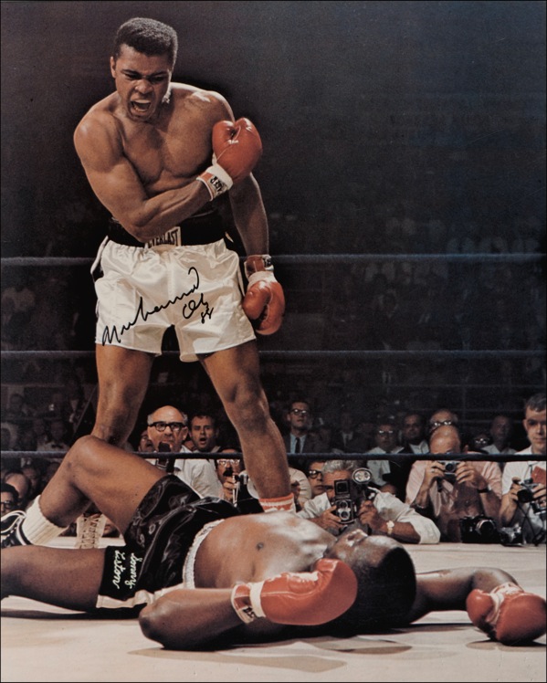 Iconic color satin-finish 16 x 20 photo of Ali standing over a fallen Sonny Liston, signed in black felt tip, “Muhammad Ali 88.” In very fine condition. Auction LOA Steve Grad/PSA/DNA and R&R COA.