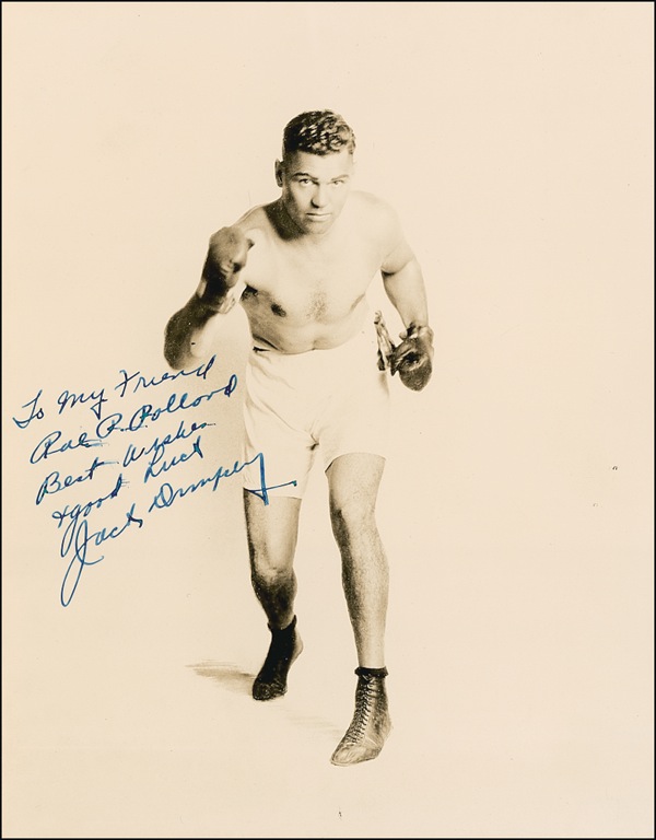 Vintage glossy 8 x 10 photo of Dempsey throwing a right, signed and inscribed in fountain pen “To my friend Rae R. Pollard, Best wishes & good luck, Jack Dempsey.” In fine condition, with some scattered light surface marks and creases, and a couple trivial brushes to inscription. Auction LOA Steve Grad/PSA/DNA and R&R COA.