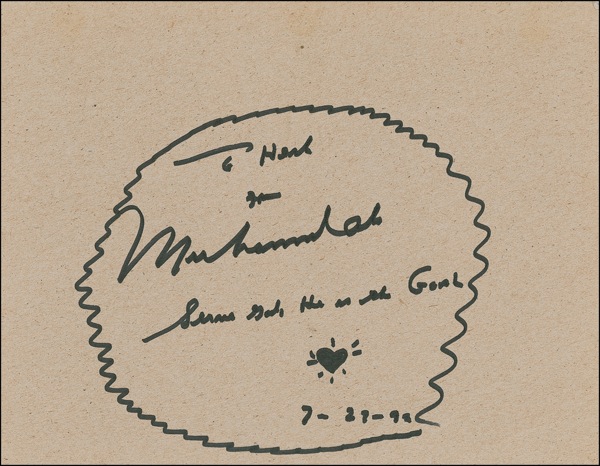 Felt tip signature and sentiment, “To Herb from Muhammad Ali, Serve God, He is the goal, 7-22-99,” adding a small sketch of a heart, on a heavy tan 11 x 8.5 card. A few subtle bends to blank portions, otherwise fine condition. Auction LOA Steve Grad/PSA/DNA and R&R COA.