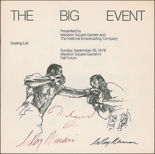 Program-style seating list for the dinner in honor of an impending fight between Ali and Ken Norton at Madison Square Garden, including such notables as Whitey Ford, Joe Frazier, et al, 8 x 8, September 26, 1976, signed on the cover in red ballpoint by Muhammad Ali and LeRoy Neiman (who provided the illustration). Mild toning and handling wear and a few ink notations to interior, otherwise fine condition. Auction LOA Steve Grad/PSA/DNA and R&R COA.
