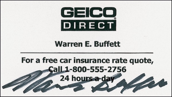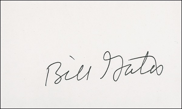 Two items: Ink signature, “Bill Gates,” on an off-white 5 x 3 card; and Buffett’s Geico Direct business card, 3.5 x 2, signed across the front in black felt tip. Accompanied by a letter from Microsoft, acknowledging Gates’s signature, which was provided for a charity auction. In very fine condition. R&R COA.