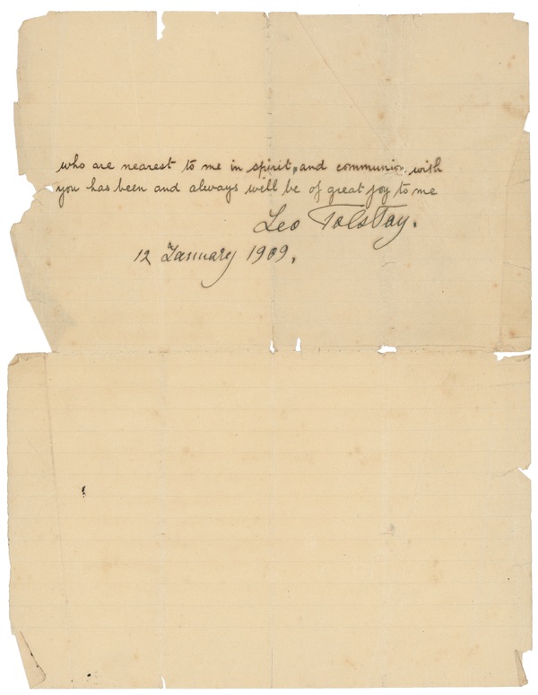 Russian novelist and moral philosopher (1828–1910) best known for his classic, epic novels War and Peace and Anna Karenina. He advocated a classless, self-sufficient society that prized love and charity above economics. Putting his beliefs into practice, the aristocratic Tolstoy renounced his worldly possessions to live virtually penniless among the peasants he loved. In 1910, seeking to get closer to God, he abandoned his home and family. Leaving home secretly and accompanied only by his physician and a daughter, he died of pneumonia in a remote railway station only a few days later. LS in English, two faintly lined pages, 8.5 x 11, dated in Tolstoy’s hand January 12, 1909. Tolstoy writes from his birthplace, Yasnaya Poliana, to an unnamed recipient [possibly Captain J. R. White]. In part [spellings retained]: “I feel very guilty in not having answered your letter so long. I might justify myself by refering to my physical indisposition and old age, also to my being very much occupied.... I am writing this with full sincerity especialy now that I have attentively read your excellent paper, with which I deeply agree, and the reading of which has afforded me great joy. If I may allow myself to make any remark, it is only that your comparison of spiritual life with material life and of the human tendency to unite—with the same tendency in matter is not exact and therefore is unconvincing. In general, the idea of time and space does not contain any real objective signification, owing tho this idea being inevitably connected with the conception of infinity. For me the metaphysical basis of all is the consciousness of the separateness of each one of us. and in order to be conscious of oneself both as God and as separate from him i.e. limited, the ideas are necessary of space filled with matter and of time with unceasing motion. Kant and the German philosophers express this by recognizing that time and space are but the unavoidable forms of our thought.... Judging by your paper I see in you one of those who are nearest to me in spirit, and communion with you has been and always will be of great joy to me....” In fair to good condition, with intersecting folds (one vertical fold each to first and last name; a few small holes and separations), marginal chips and tears, a few small instances of ink erosion to text, and creasing and wrinkling. The signature itself is bold, dark, and otherwise unaffected. Auction LOA John Reznikoff/PSA/DNA and R&R COA.