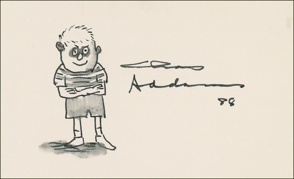 Original drawing of Pugsley Addams, ink and wash on a cream 5 x 3 card, signed “Chas. Addams, 88.” Tiny, faint spot at upper right corner, otherwise very fine condition. R&R COA.