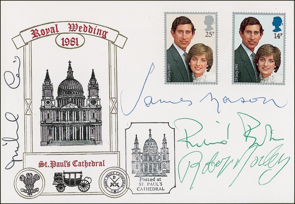 Commemorative cover, 6.5 x 4.5, bearing a cachet honoring the wedding of Charles and Diana, signed on the front in ballpoint and ink by James Mason, Richard Burton, Robert Morley, and Michael Caine. In very fine condition. R&R COA.