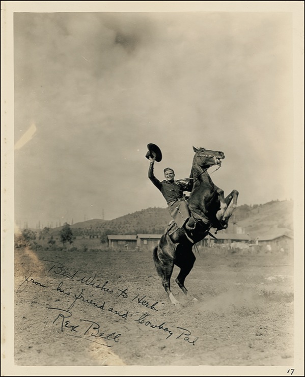 Vintage glossy 8 x 10 photo, signed and inscribed in fountain pen, “Best wishes to Herb from his friend and cowboy pal Rex Bell.” A few small creases and dings and printing irregularities resulting in light spots to background, otherwise fine condition. R&R COA.