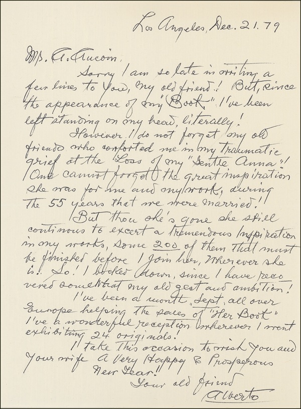 Peruvian-born American illustrator (1896–1982) best remembered for his colorful, sensuous renderings of pinup-style nudes. ALS signed “Alberto,” one page, 6.25 x 8.25, December 21, 1979. Vargas writes to noted collector Lionel Aucoin, shortly after the loss of his wife. In part, “I do not forget my old friends who comforted me in my traumatic grief at the loss of my “Gentle Anna.” One cannot forget the great inspiration she was for me and my work, during the 55 years that we were married. But thou [sic] she’s gone she still continues to exert a tremendous inspiration in my works, some 200 of them that must be finished before I join her, wherever she is. So! I backed down, since I have recovered somewhat my old zest and ambition! I’ve been a month, Sept., all over Europe helping the sales of ‘Her Book.’ I’ve a wonderful reception wherever I went exhibiting 24 originals!” Accompanied by the original mailing envelope, addressed in Vargas’s hand, and signed in full in the return address area, “Alberto Vargas.” In very fine condition. R&R COA.