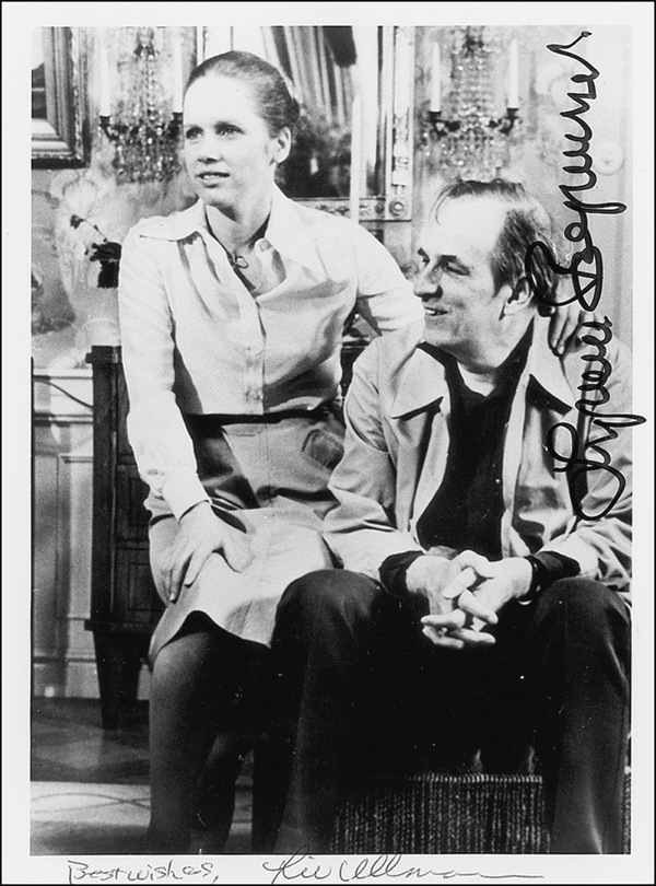 Glossy 7 x 9.5 photo, signed in black felt tip “Ingmar Bergman” and in ballpoint “Best wishes, Liv Ullman.” In very fine condition. R&R COA.