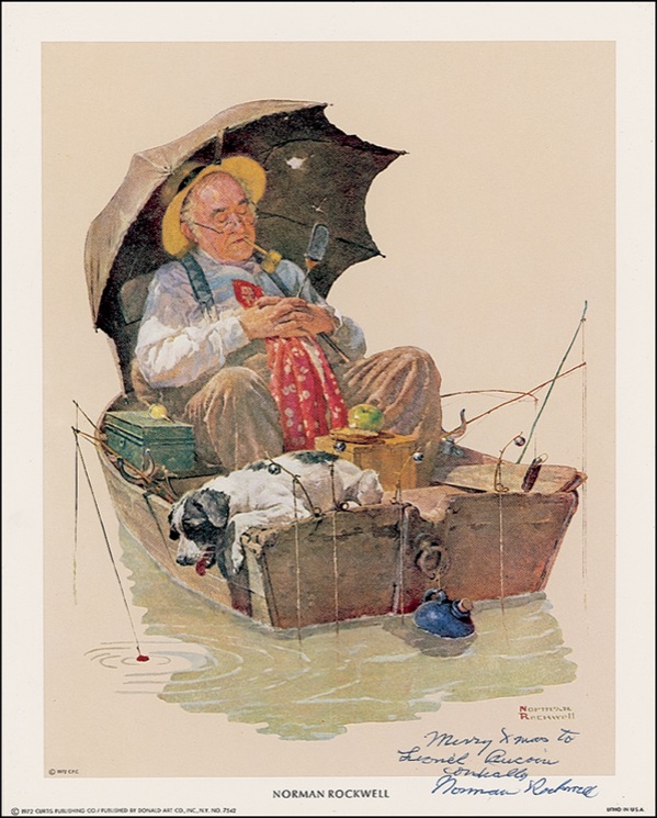 Color 8 x 10 print of an elderly gentleman trying his luck at fishing while stealing a nap, signed and inscribed in blue ballpoint, “Merry Xmas to Lionel Aucoin, Cordially, Norman Rockwell.” In very fine condition. R&R COA.