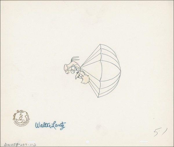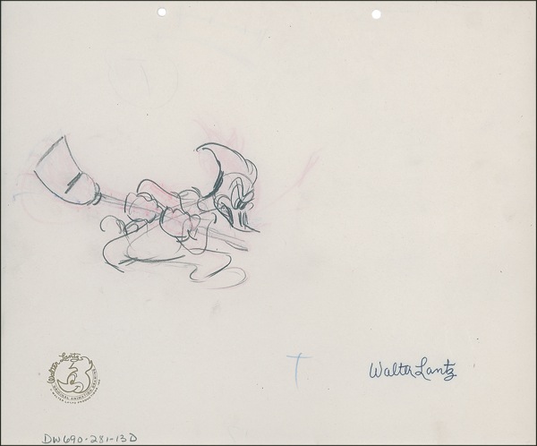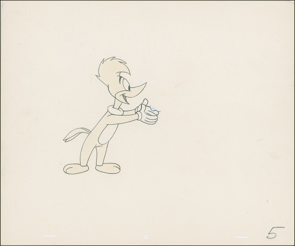 Three original pencil animation drawings of Woody Woodpecker on 12.5 x 10.5 animation sheets (in both orientations), each signed in black felt tip “Walter Lantz.” Accompanied by three certificates of authenticity from MCA/Universal and two unsigned animation drawings. Scattered handling wear and slight haloing to signatures, otherwise fine condition. R&R COA.