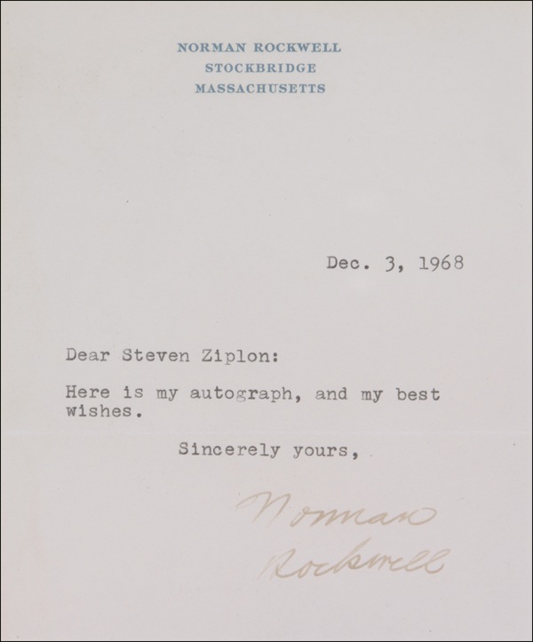 TLS, one page, 4.75 x 5.75, personal letterhead, December 3, 1968. Rockwell writes to Steven Ziplon. In full: “Here is my autograph, and my best wishes.” Matted and framed with a color print to an overall size of 17.75 x 27.25. Signature just a shade light, otherwise fine condition. R&R COA. Oversized.